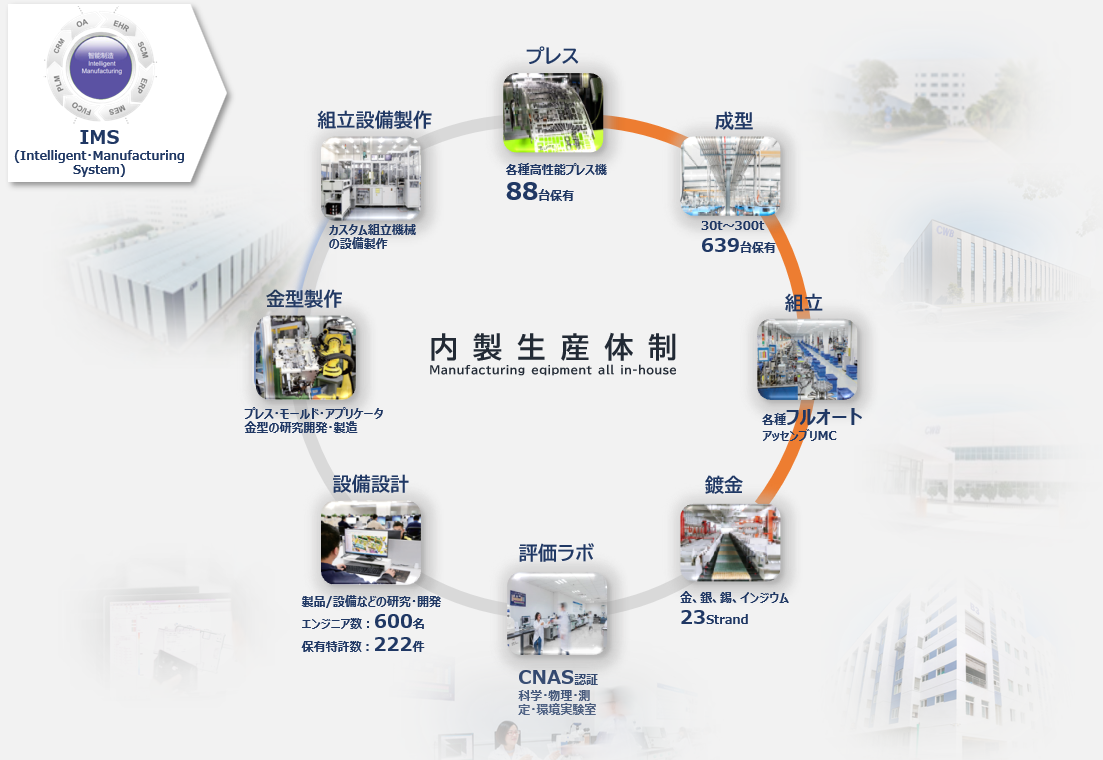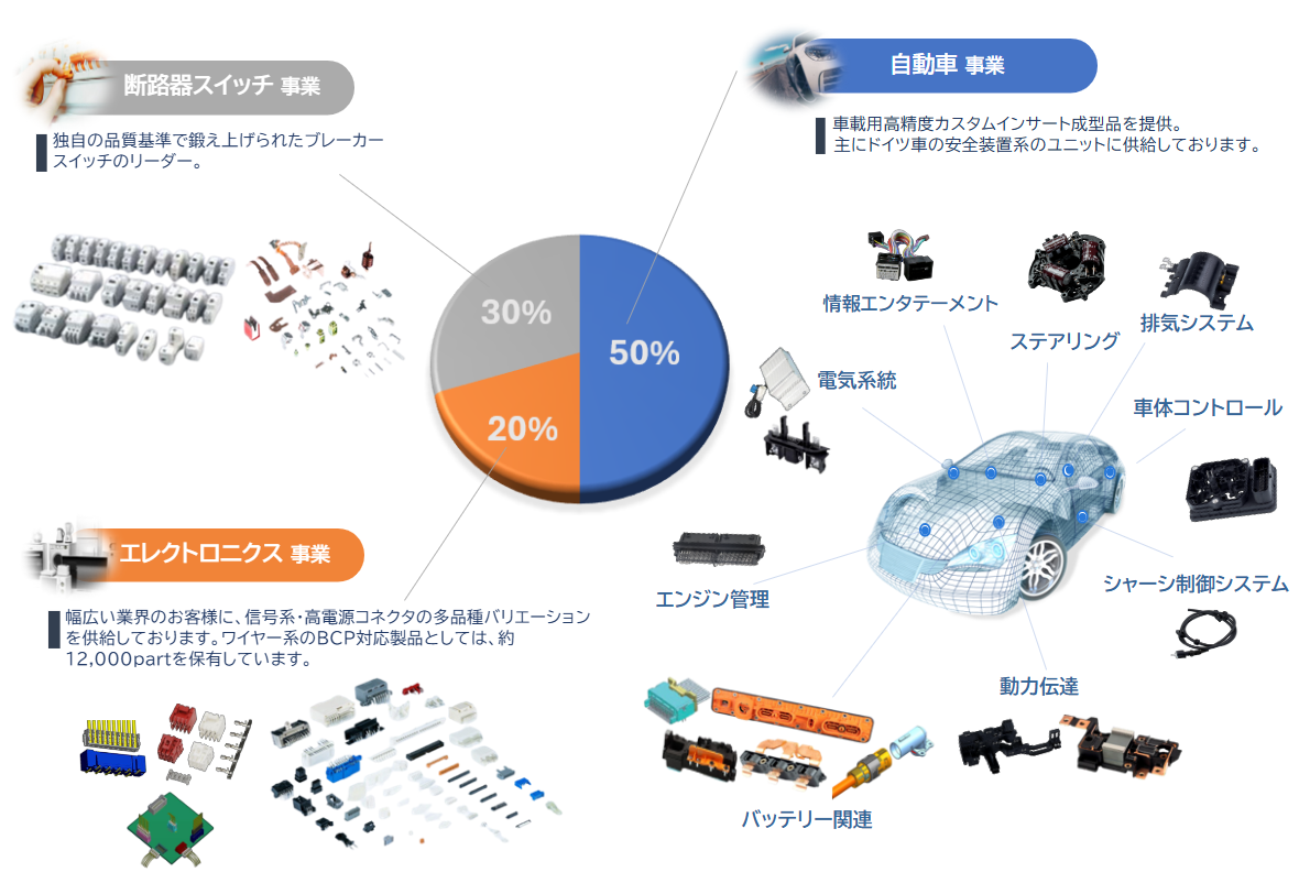 当社は自動車産業領域・エレクトロニクス産領域を中心に、幅広い産業分野において、高精度なカスタムインサート成型品や汎用コネクタなどを扱う製造メーカーです。